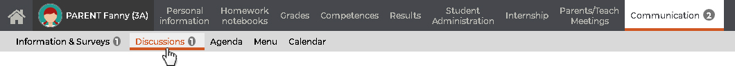 A discussion is an exchange of messages between at least two participants via the internal messaging service of PRONOTE. When a message is sent to you (or when you receive information or a survey), a notification is indicated in the tab Communication. As long as you have not consulted the elements, this notification remains active.