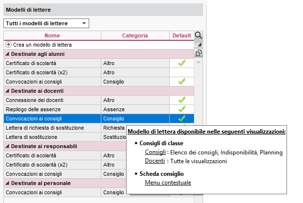 La categoria di un modello di lettera o di SMS determina le visualizzazione a partire dalle quali si può inviare la lettera o l'SMS, nonché le variabili che è possibile inserirvi. La categoria di una lettera o di un SMS si indica nel momento in cui si crea un modello.